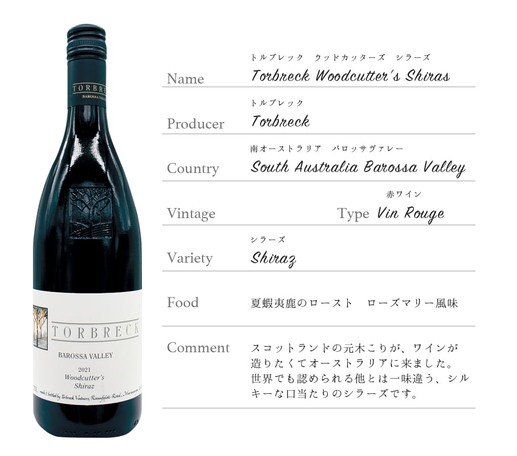 スコットランドの元木こりが、ワインが造りたくてオーストラリアに来ました。世界でも認められる他とは一味違う、シルキーな口当たりのシラーズです。