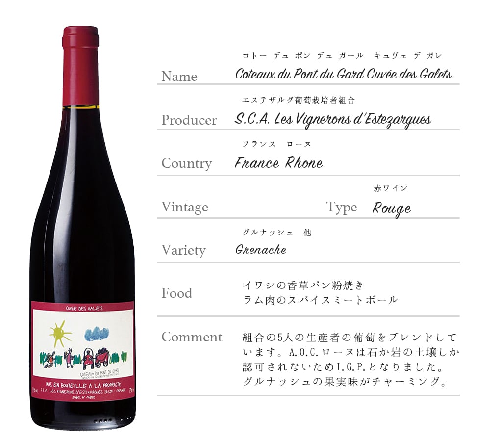 組合の5人の生産者の葡萄をブレンドしています。A.O.C.ローヌは石か岩の土壌しか認可されないためI.G.P.となりました。グルナッシュの果実味がチャーミング。