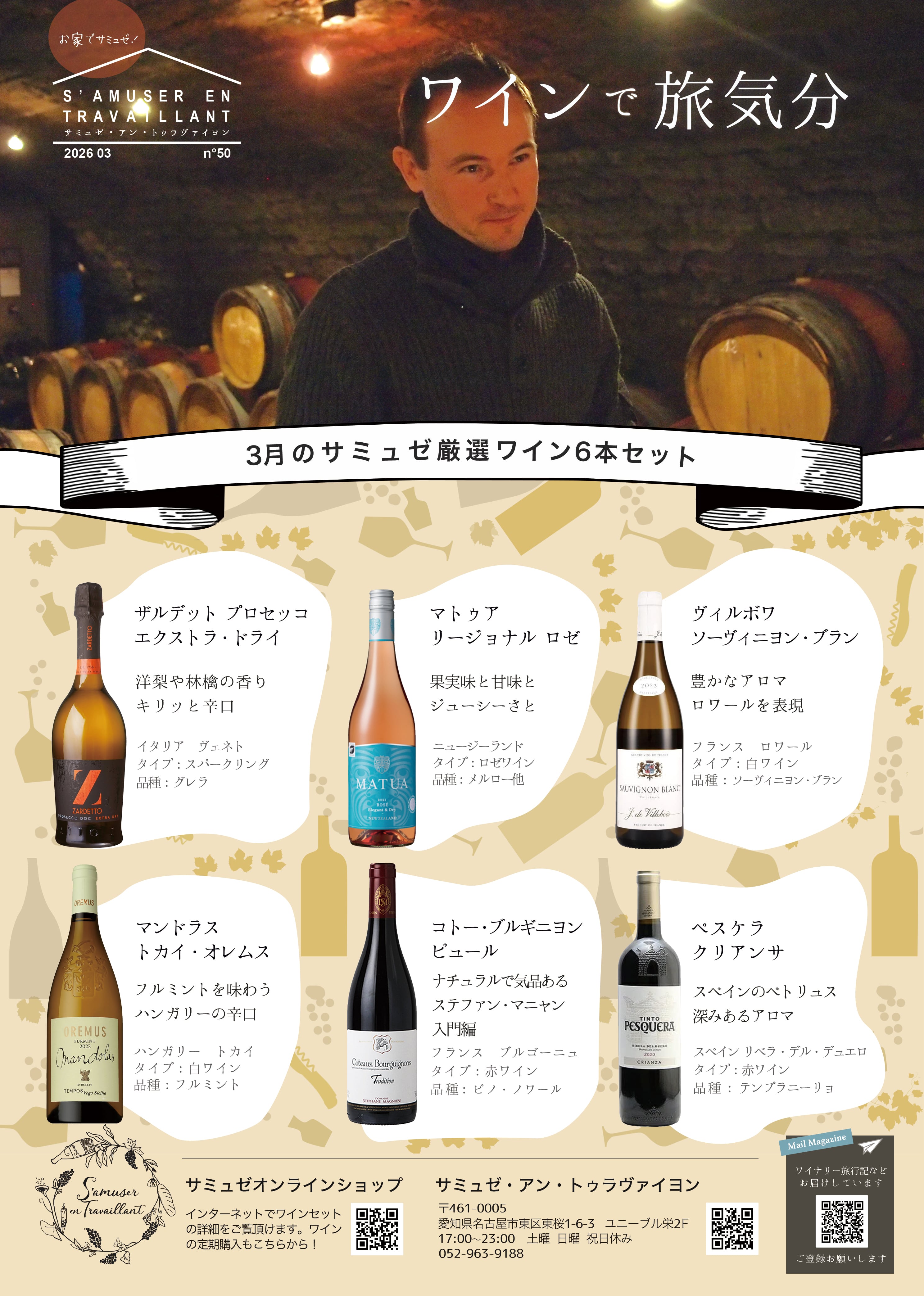 サミュゼのソムリエールが厳選したワインセットです。内容はお任せ下さい。毎月違うワインをお選びします。ワインを選ぶ手前もなく美味しいワインをご自宅でお楽しみ頂けます。