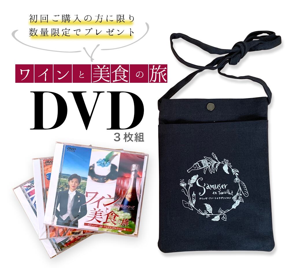 初回購入限定でワイン産地を旅したDVDをプレゼント!サミュゼオリジナルバックに入れてお届けいたします。