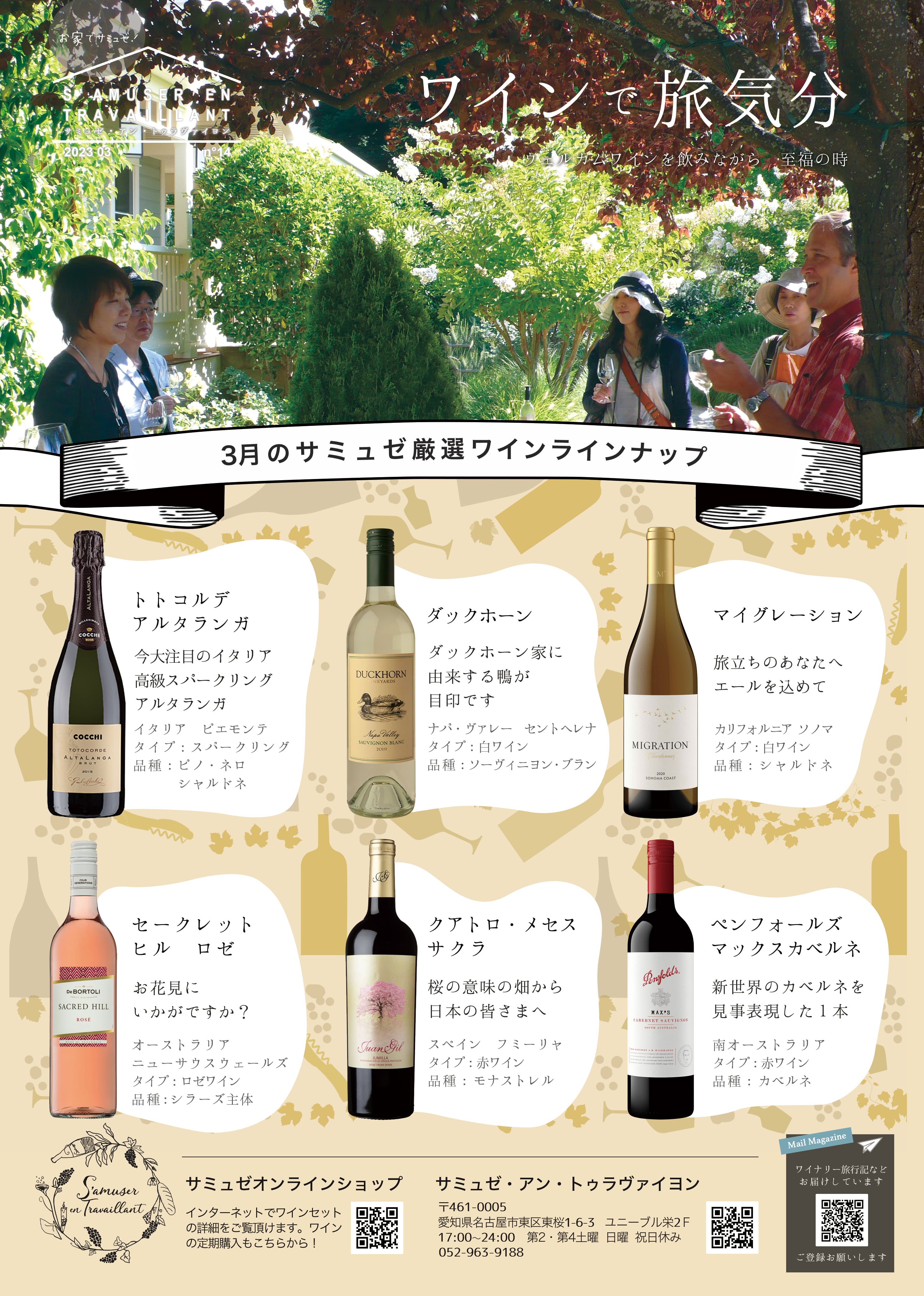 そろそろ暖かく感じる日が増えてきましたね。3月後半には桜も開花することですし、今回は春満載なワインをセレクトしました。お花見に持参してもいいし、お家でお花見気分を味わっていただいてもGood!一足お先に春をお楽しみください。