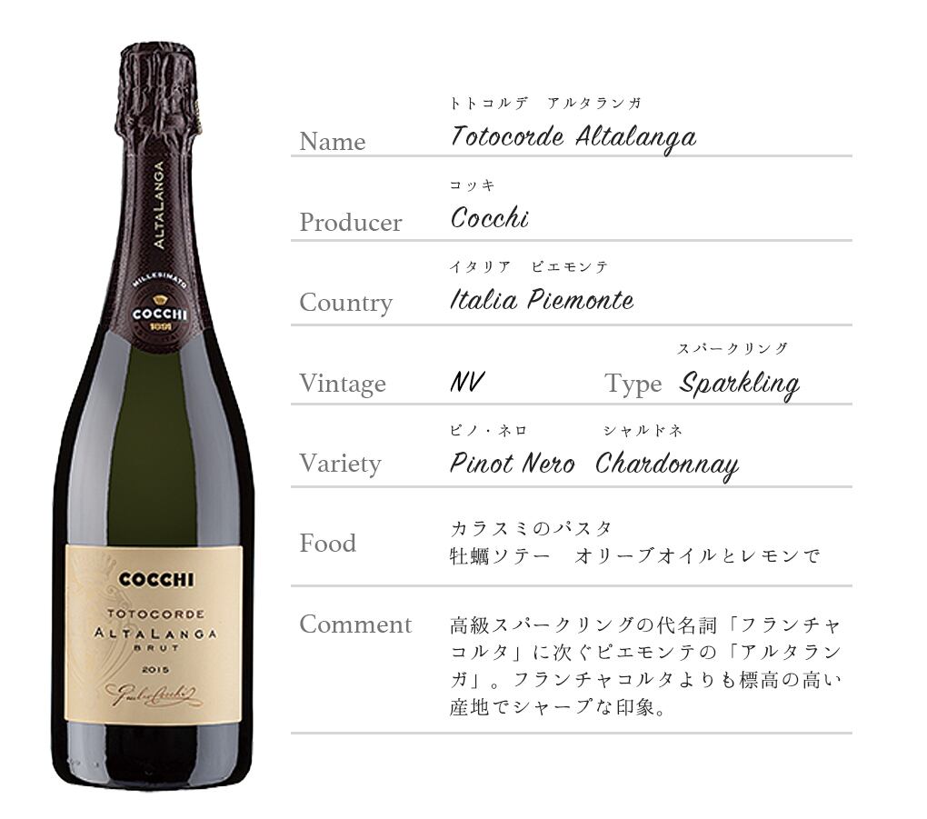 高級スパークリングの代名詞「フランチャコルタ」に次ぐピエモンテの「アルタランガ」。フランチャコルタよりも標高の高い産地でシャープな印象。