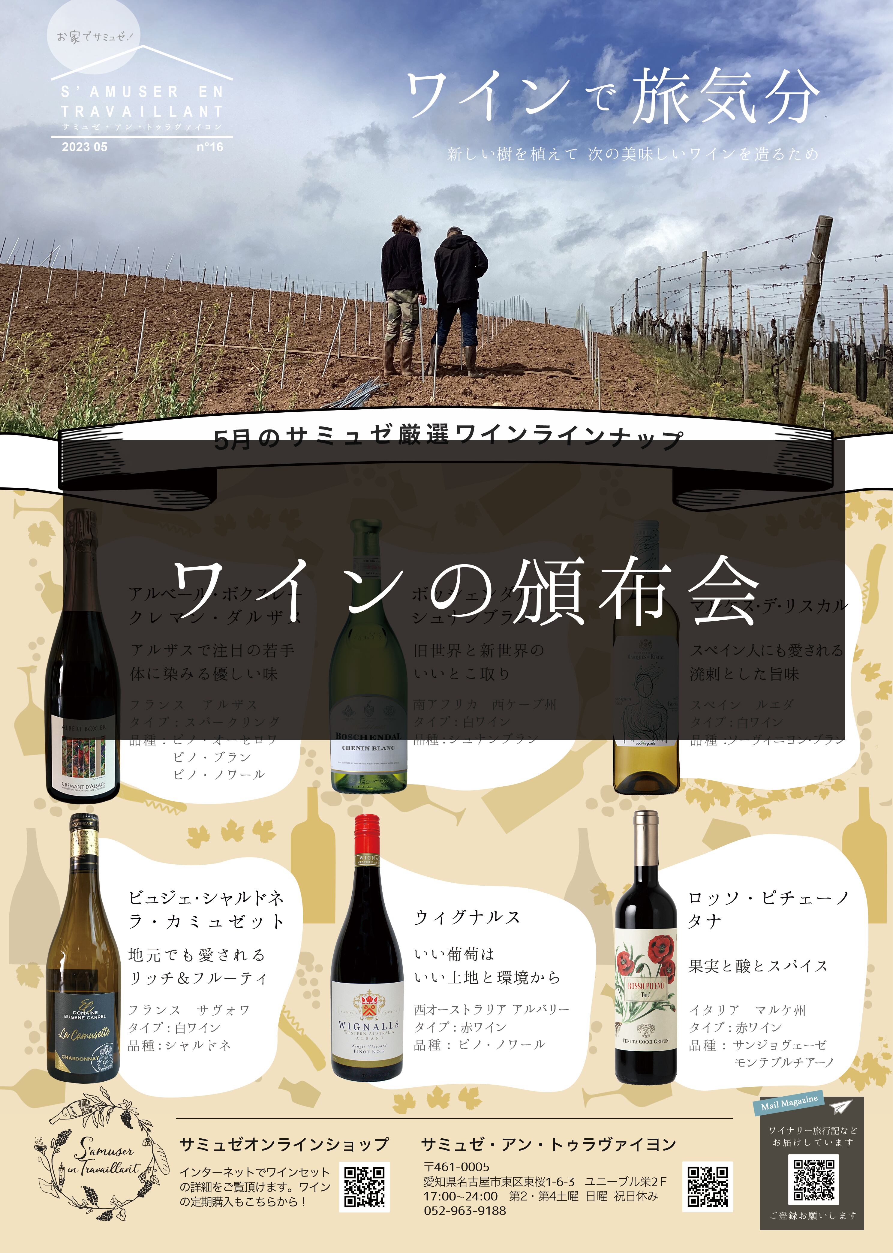 5月号はアルザスの泡を中心に選びました。口当たりの優しく酸もあってずっと飲み続けられる味。他のワインも初夏に飲みたくなるサミュゼ味のワインたちです。